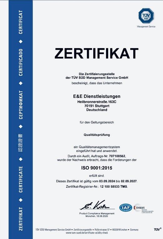 „Die E&E Dienstleistungen ist offiziell nach ISO 9001:2015 zertifiziert.
